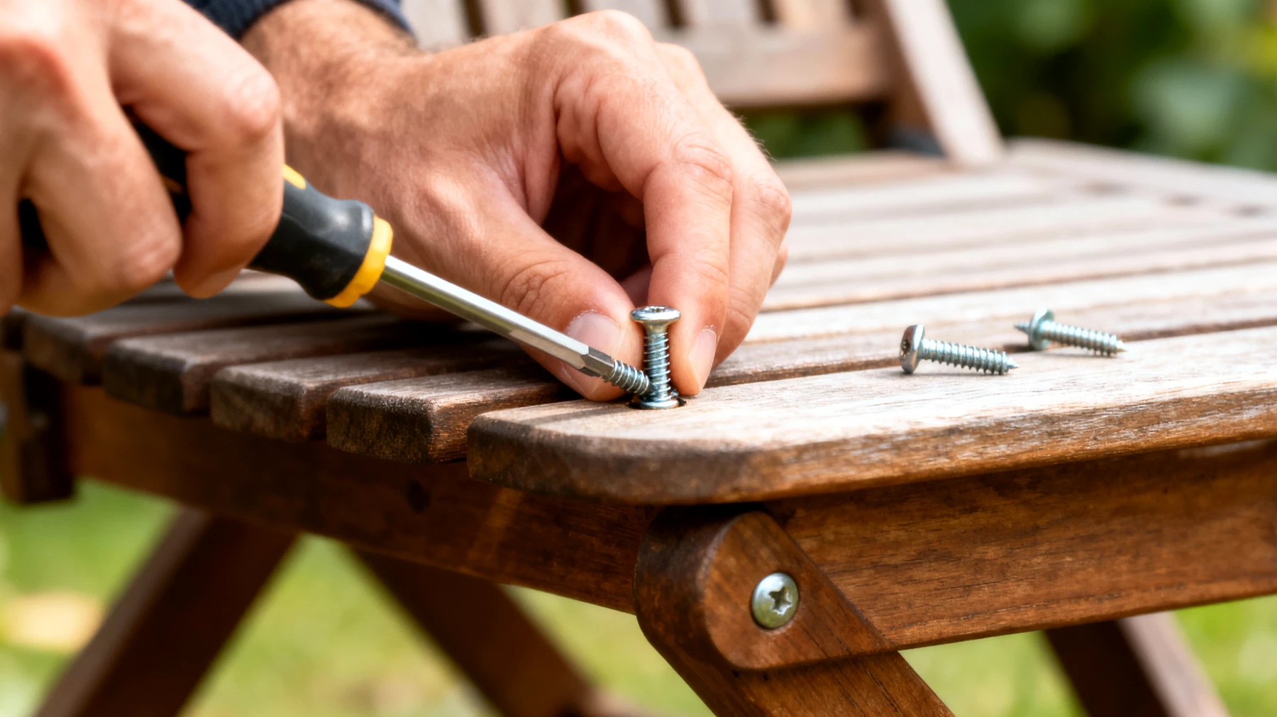 Holz nimmt Feuchtigkeit aus der Luft auf und gibt sie wieder ab. Diese ständige mikroskopische Bewegung führt dazu, dass Zapfen, Dübel und Schraubenverbindungen lose werden, besonders bei Gartenmöbeln, die zwischen Sonne, Regen und nächtlicher Abkühlung wechseln. Metallteile, die sich bei Temperaturerhöhung ausdehnen, verstärken diesen Effekt zusätzlich: Sie lockern das Holz rund um die Schrauben und erzeugen Spiel in der Verbindung.