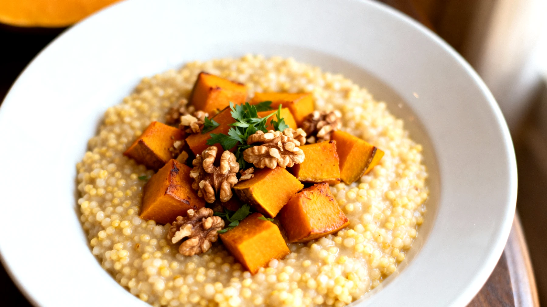 Für die Zubereitung empfiehlt sich folgendes Vorgehen: Hirse im Verhältnis 1:2,5 mit Gemüsebrühe etwa 10 Minuten bei niedriger bis mittlerer Hitze köcheln lassen, dabei gelegentlich umrühren. Anschließend weitere 10 Minuten quellen lassen – diese Quellphase ist entscheidend für die optimale Konsistenz und Verdaulichkeit. Der gewürfelte Kürbis wird separat geröstet, bis er leichte Karamellnoten entwickelt, und erst zum Schluss untergehoben. Die gehackten Walnüsse werden kurz vor dem Servieren zugegeben, damit sie ihre knackige Textur behalten.
