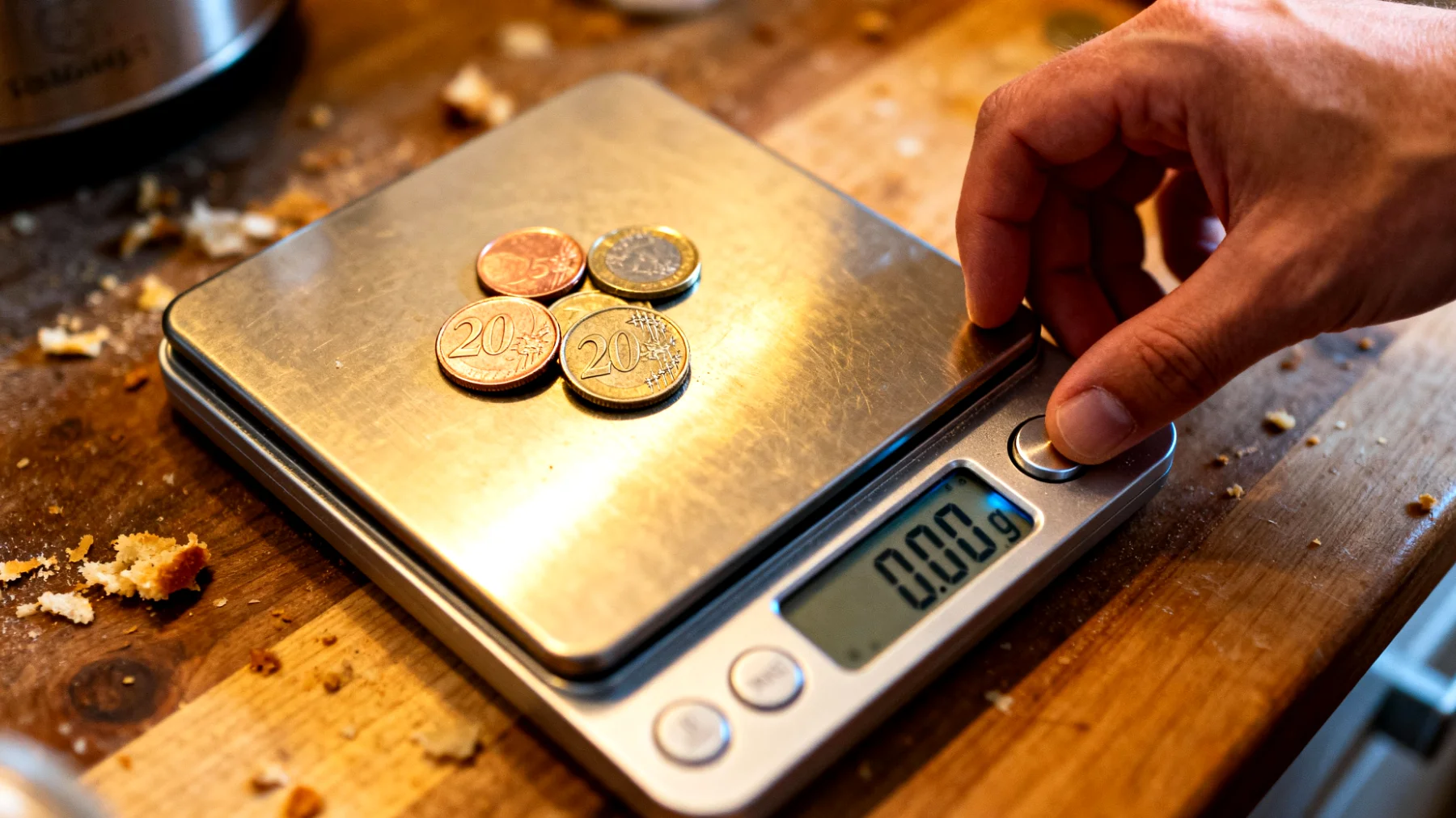Ein simpler Trick für Haushalte ohne offizielles Kalibriergewicht nutzt die präzise Standardisierung von Euromünzen. Die 1-Euro-Münze wiegt exakt 7,50 g, die 2-Euro-Münze 8,50 g. Mehrere gleiche Münzen ergeben reproduzierbare Referenzwerte. Zehn 1-Euro-Münzen sollten also exakt 75,0 g wiegen, zehn 2-Euro-Münzen 85,0 g. Diese Methode hat ihre Grenzen – abgenutzte oder verschmutzte Münzen weichen vom Nominalgewicht ab, und die Methode eignet sich nicht für sehr präzise Anwendungen. Dennoch bietet sie eine zugängliche Möglichkeit für grundlegende Funktionsprüfungen.