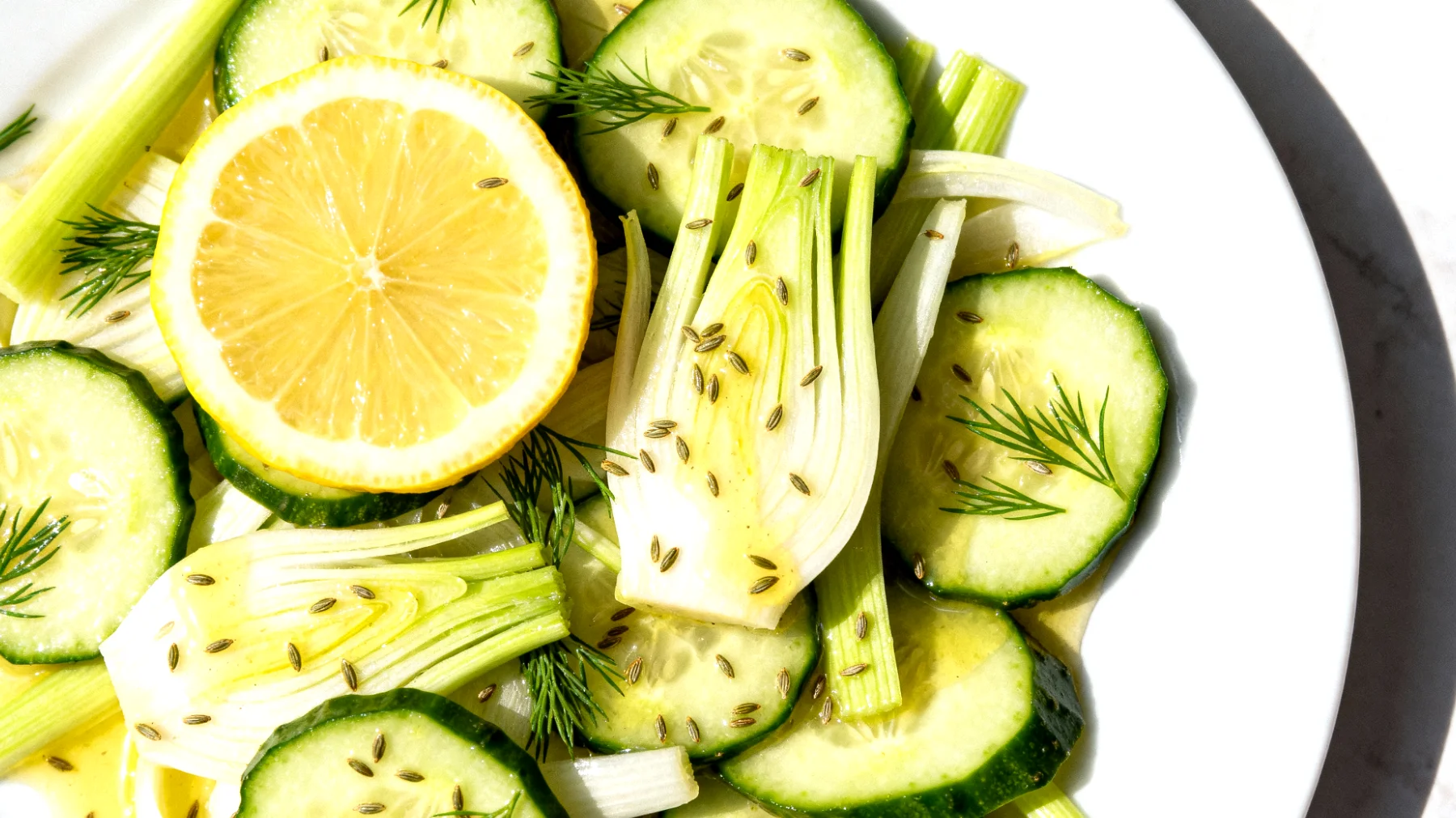 Der Saft einer halben Zitrone liefert etwa 25 Milligramm Vitamin C und macht den Salat nicht nur geschmacklich interessant. Vitamin C unterstützt die Kollagenbildung und damit die Festigkeit der Blutgefäßwände. Zudem fördert die Säure die Aufnahme der Mineralstoffe aus Fenchel und Gurke. Die leichte Säure wirkt außerdem belebend – genau das Richtige für müde Momente in der Nacht.